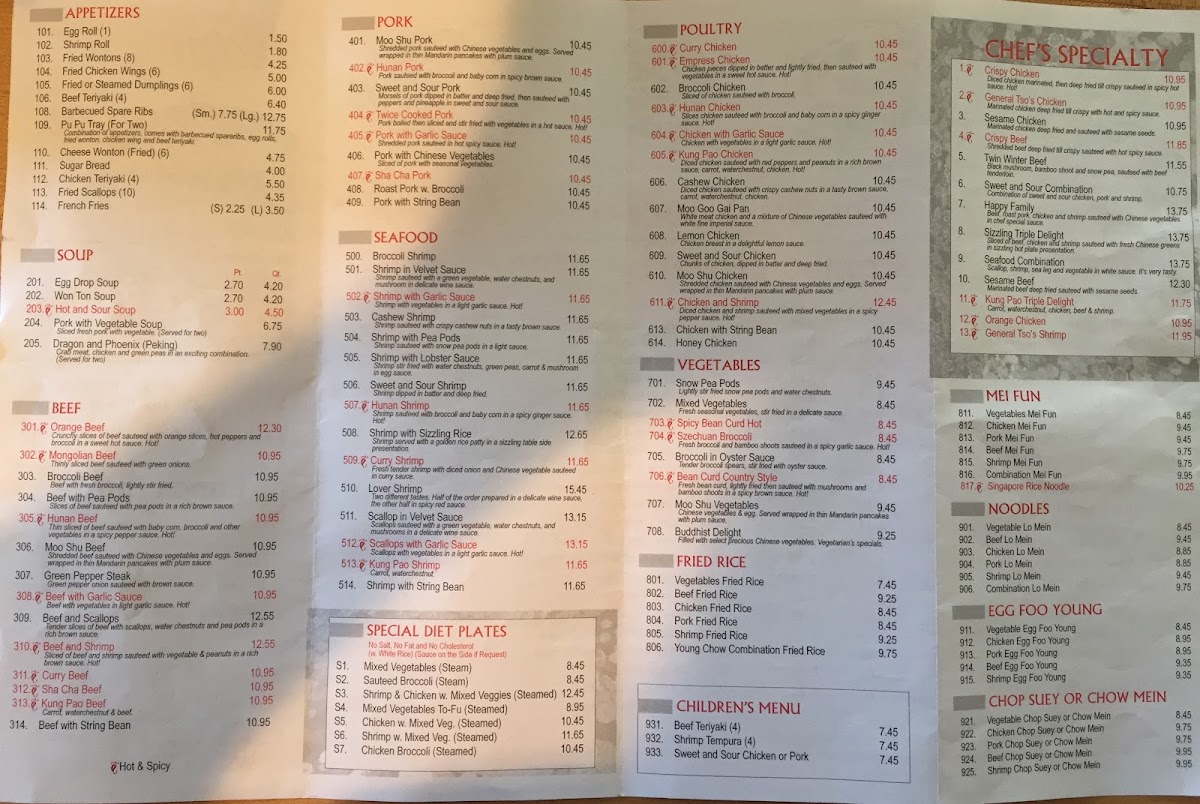 Highlights include several versions of chop suey — from vegetable to shrimp — each a balanced, hearty choice perfect for those seeking a warm, home-style meal. Combo platters like Moo Goo Gai Pan and Szechuan Beef provide a convenient way to explore different tastes and textures, fitting well with the restaurant’s easygoing and welcoming atmosphere.