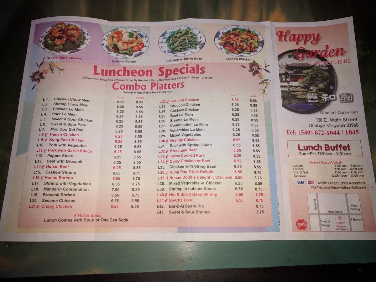 For those in the mood for something a bit more distinctive, the chef’s specialties such as Kung Pao Triple Delight or Sesame Chicken offer mildly spiced, richly seasoned options that complement the overall simple, inviting dining experience. The generous portions encourage sharing or taking some home, making Happy Garden a practical option for a satisfying meal without fuss.